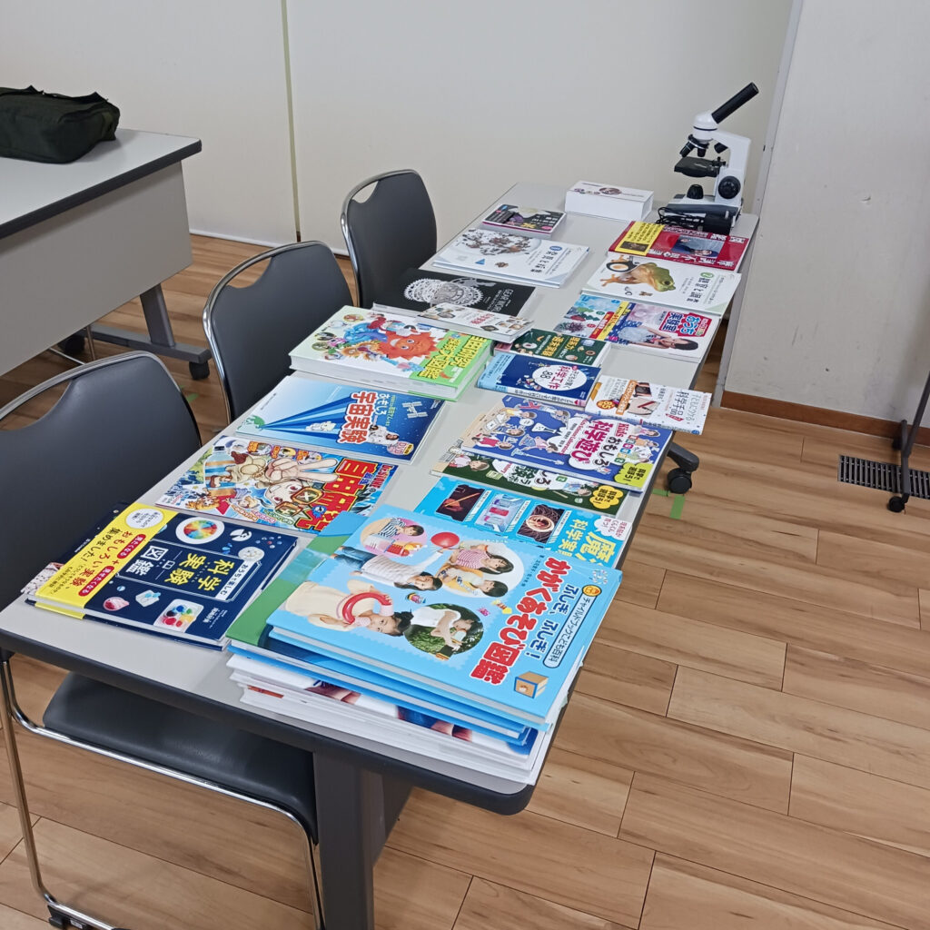 生物・物理・地学の分野に分かれて、グループごとに自由研究をすすめます。森田講師が用意してくれた本や顕微鏡にふれ、自分たちのできそうなことを話し合いました。サイエンスを通じた仲間づくりができそうです。
