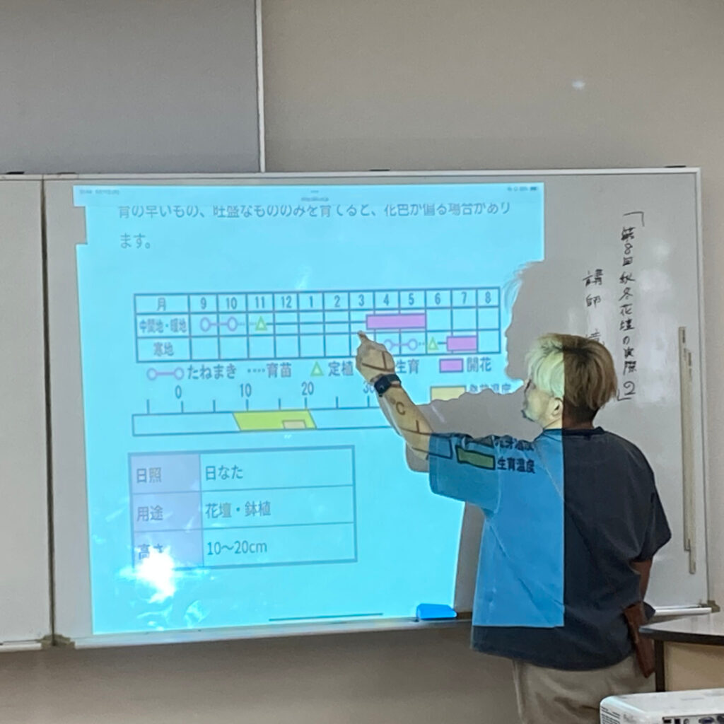 9月11日の花づくり学科のテーマは「秋冬花壇の実際② 花壇デザイン概論 種まき・育苗について」。