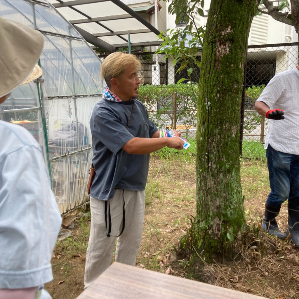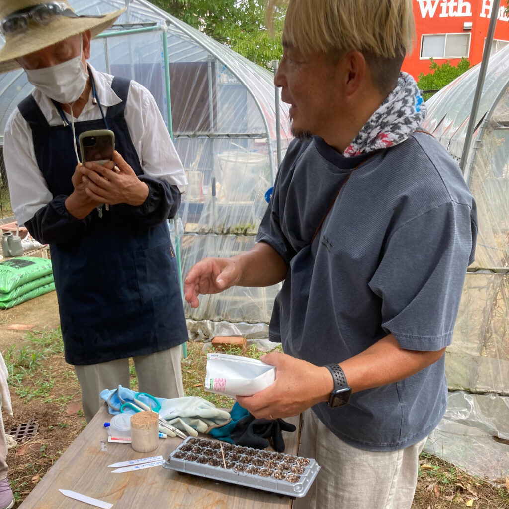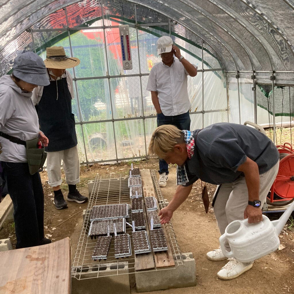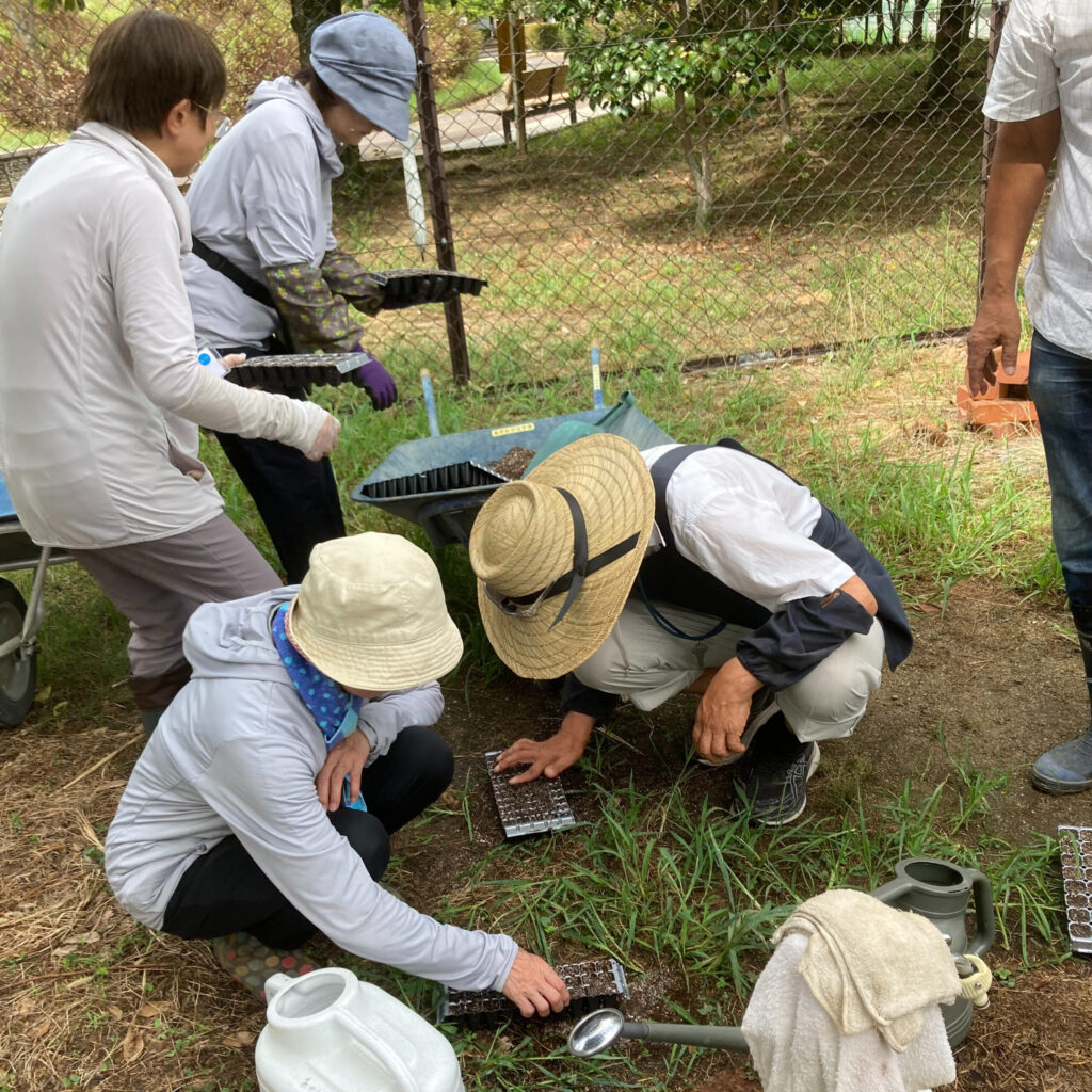 夏休みの課題であった秋冬花壇のデザインについて、各自がテーマや意図を発表し、境講師からコメントをいただきました。それぞれの想い・考えがよくわかる時間となり、たいへん勉強になりました。投票の多かったデザインの種を発注し、種まきをしました。ゴマより小さな種をプラグトレーに植え、覆土し育苗が始まります。