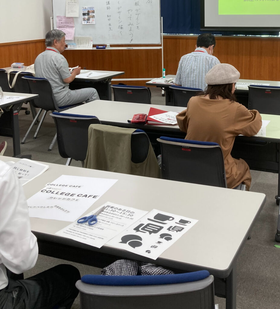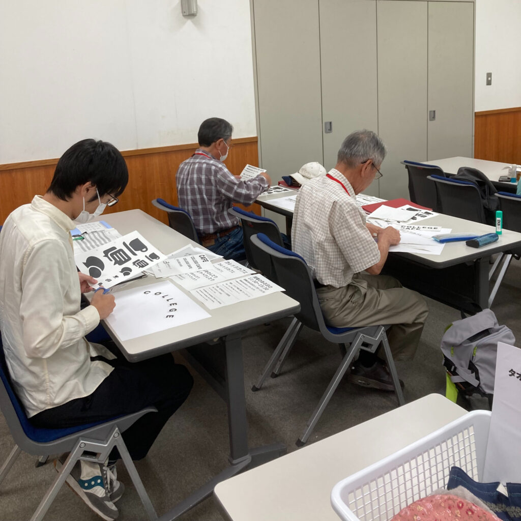 今年度2回目の和田講師のデザインの授業です。今回は、パソコンを使わずに、受講生全員が同じ素材を使って1枚のチラシを作るワークショップをしました。講師からデザインの見せ方について学んだあと、それぞれが紙に印刷されたデザインをはさみで切り抜き、A3用紙にのりで貼ってチラシを作成。完成した作品を貼り出し、互いに感想を述べ合いました。