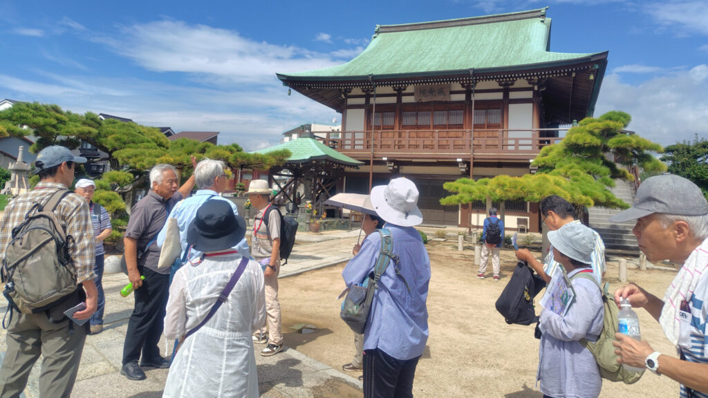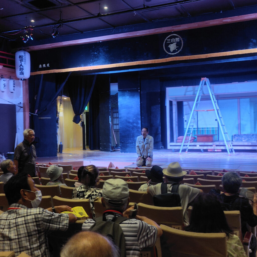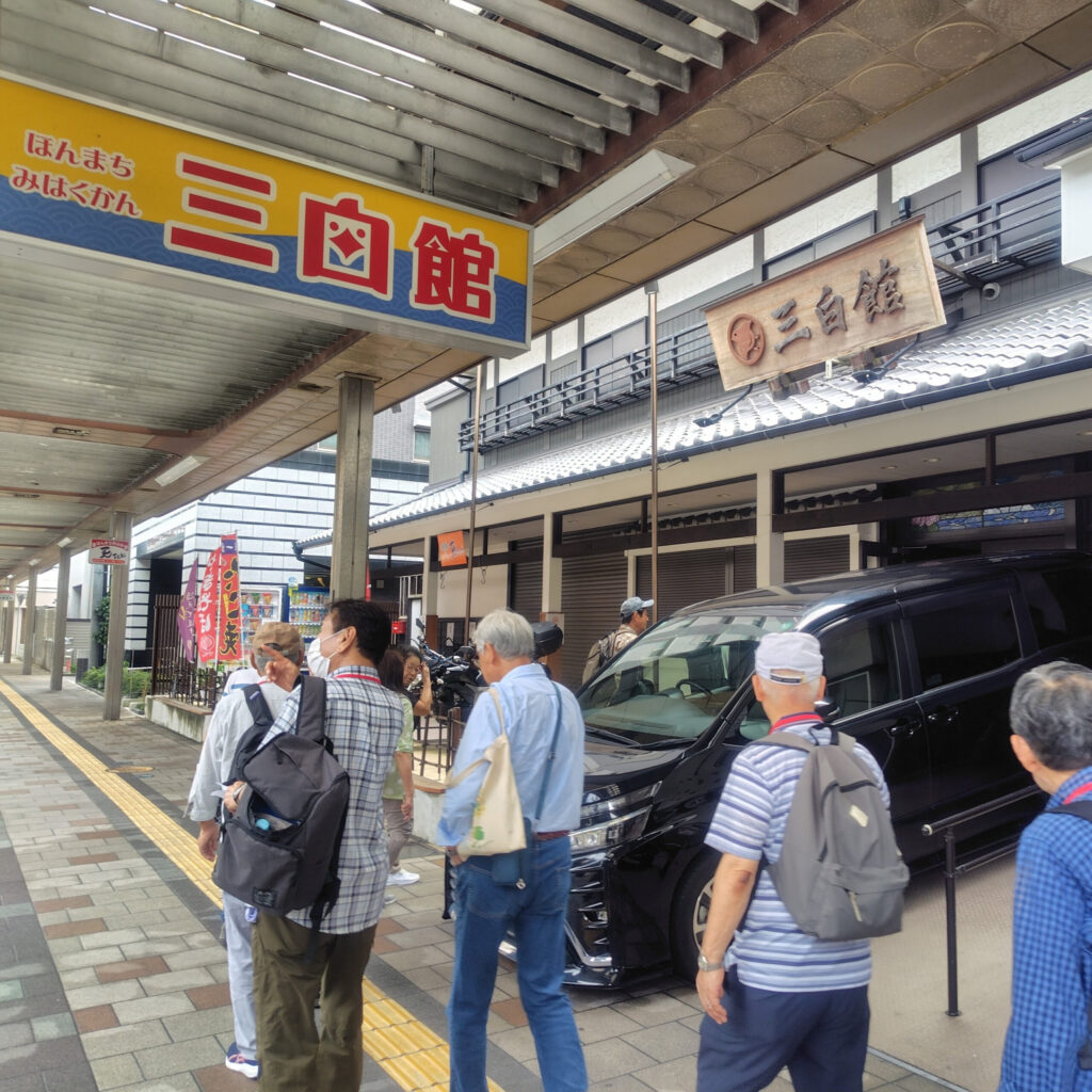 明石駅をスタートし、白雲通りから枝垂れ桜の名所、そこから二つの光明寺を横目にかつての三白亭へ。ご好意で中の見学ができました。松下人形店の松下社長様から現在の三白館への歴史や建物の構造などのお話を伺い、しばし昭和にタイムスリップ。
