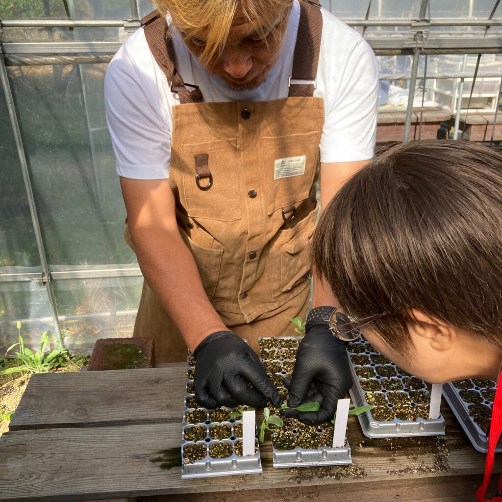プラグトレーの苗を前回作った土に植え替えます。9センチのポットに土を入れ穴をあけ、小さな芽をそっと竹串ですくい上げ、うまく密着しますようにと丁寧に押さえます。