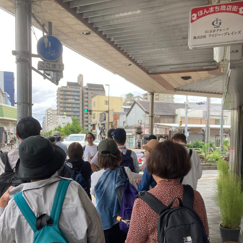 受講生は9:45に岩屋神社で集合。西国街道を通り休天神社、人丸駅近辺の天井川の暗渠を見て、亀の水、柿本神社(人丸神社)まで、明石の地形や町の成り立ちを防災対策の目線で歩きました。
