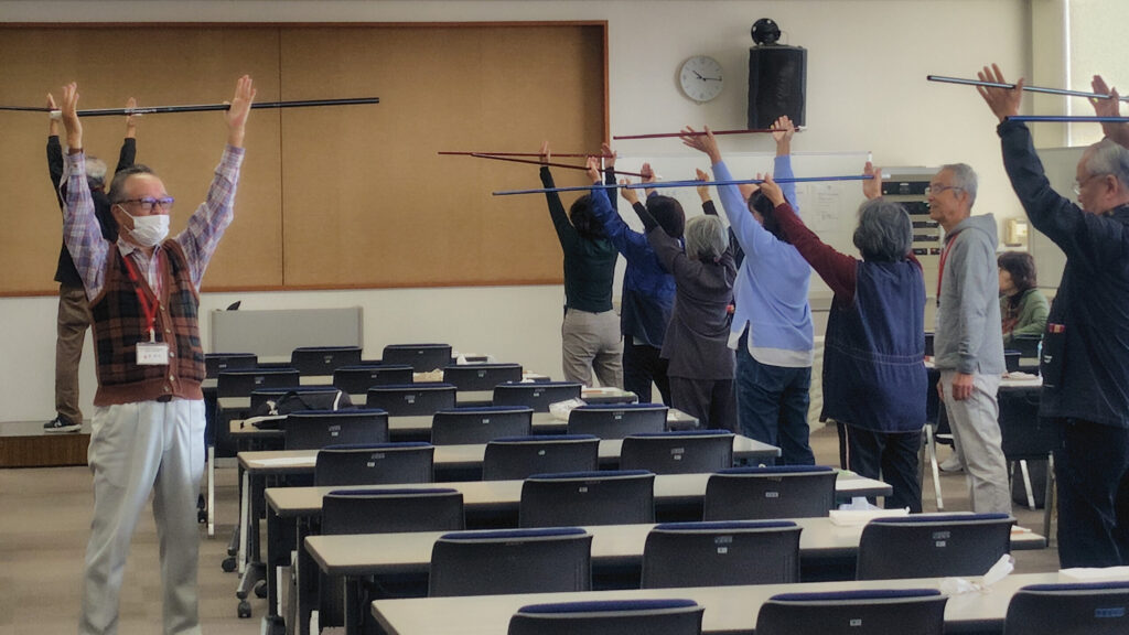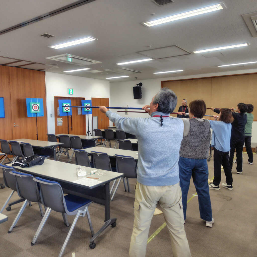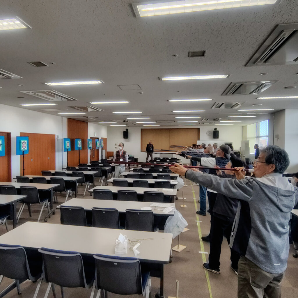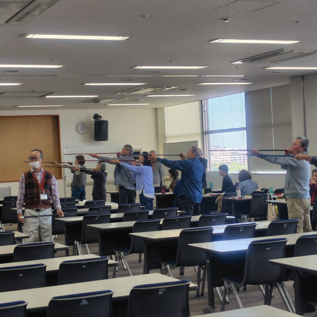 吹矢で連想するものと言えば「忍者」。だからというわけではありませんが、「危険じゃないの?」から始まった今回の講座。日本スポーツウェルネス吹矢協会兵庫明石支部の6人の忍者(いえ講師の皆様です!)の指導の下、まずは用具の説明と「スポーツウェルネス吹矢式腹式呼吸法」を行うための「基本動作」を学びました。