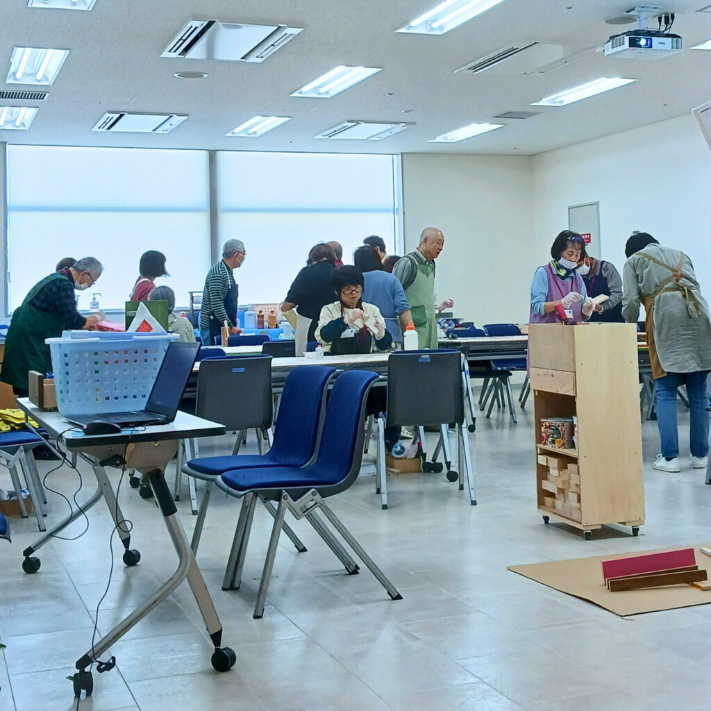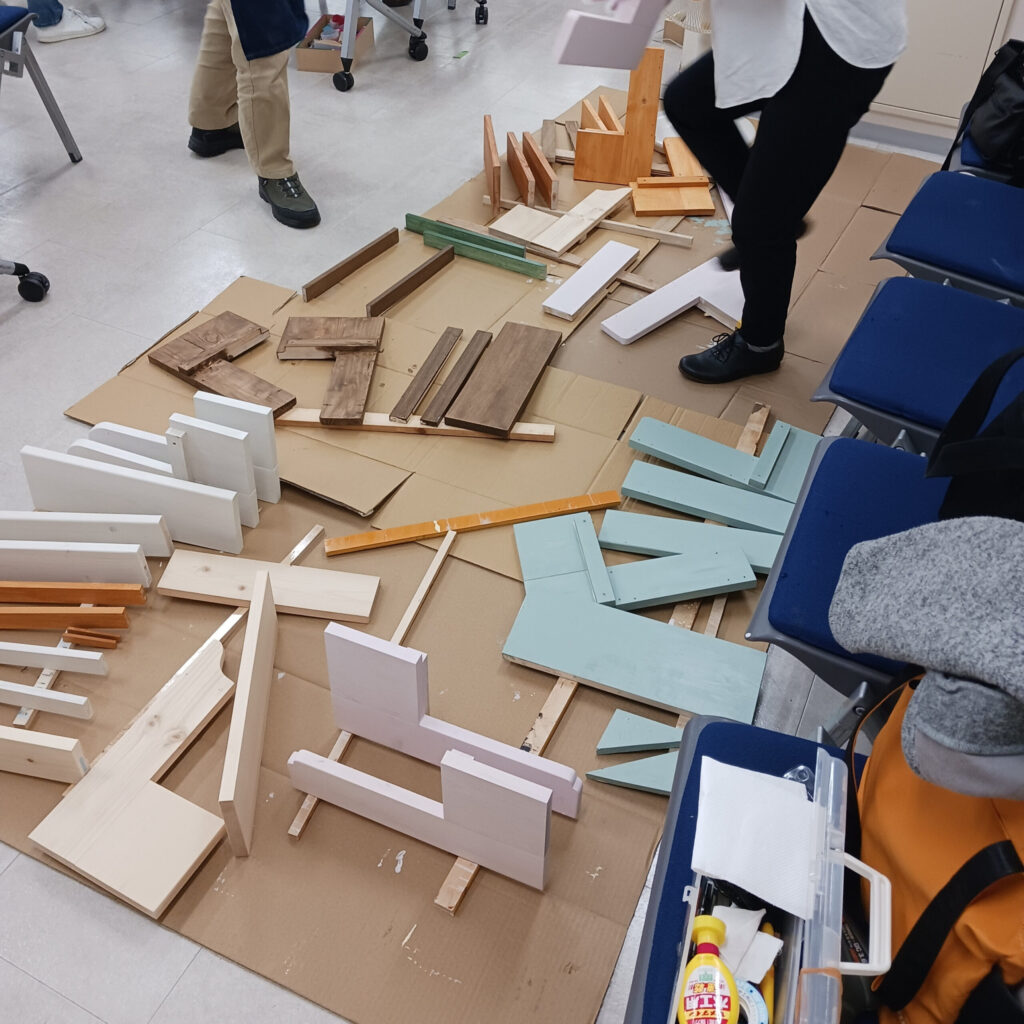 11月10日のものづくり学科は、「ディスプレイシェルフ」の制作の2回目です。今回は、主に塗装について学び、取り組みました。
