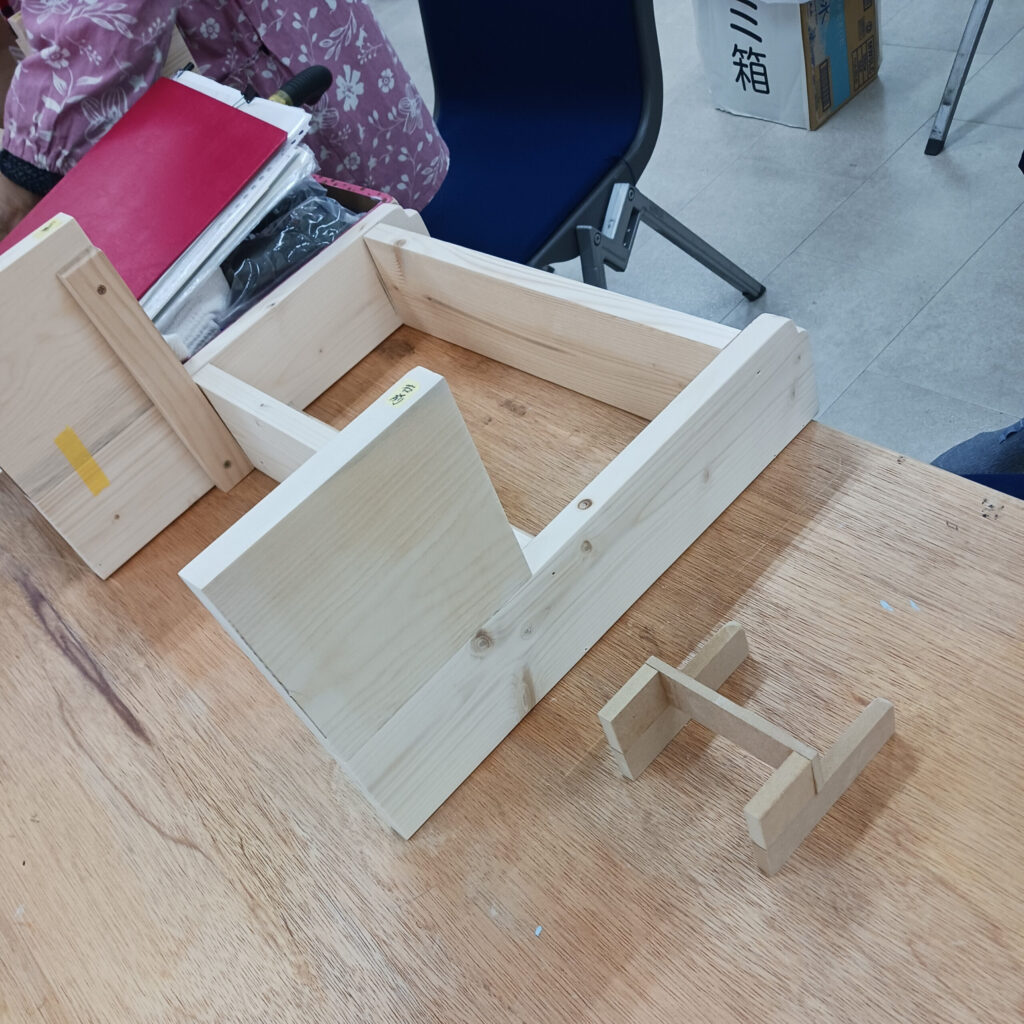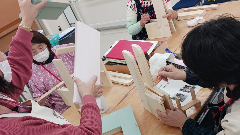 各部に「やすりがけ」など加工を行い、出来上がりをイメージして、配色を考えたり塗装が不要な接地面などを塗装前に確認しました。