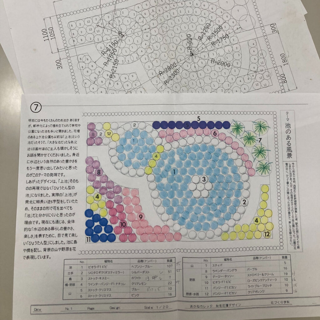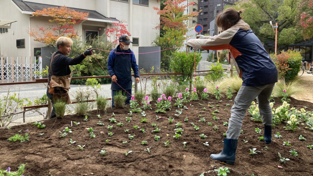デザインに従い、育てた花の苗を植え付けていきます。曲線のデザインが多く、間隔の取り方が難しかったですが、「植え付けが難しいほど花が咲いたときはキレイですよ」と境講師。