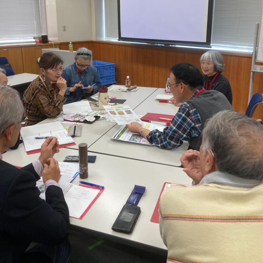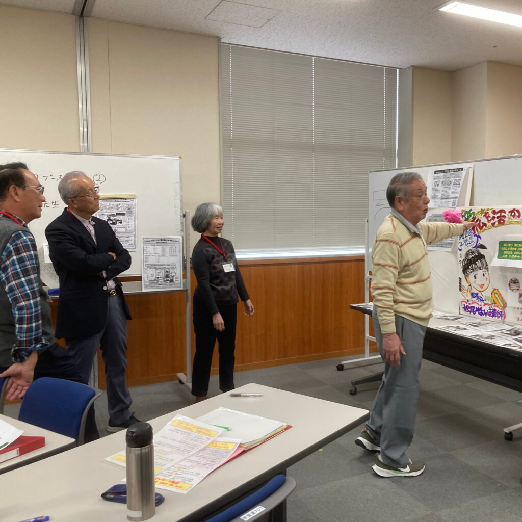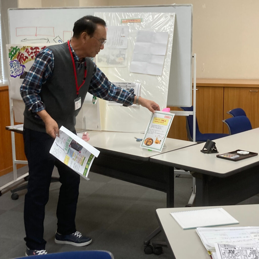 まず最初に、ウィズフェス出展に向けて、受講生それぞれのアイデアを持ち寄り意見交換をしました。松尾講師が意見の整理をし、作業部会方式でパネルを作る班、資料を作る班、体験コーナーを計画する班と役割を決めてからスムーズに話が進みました。