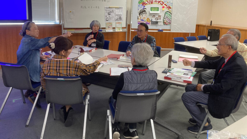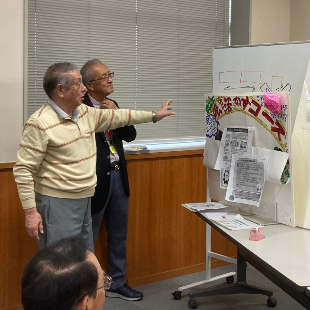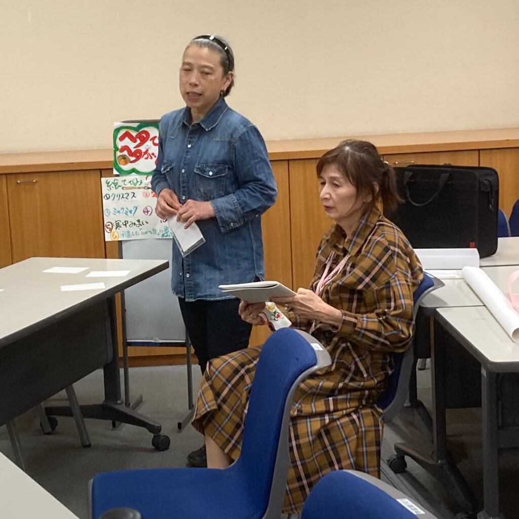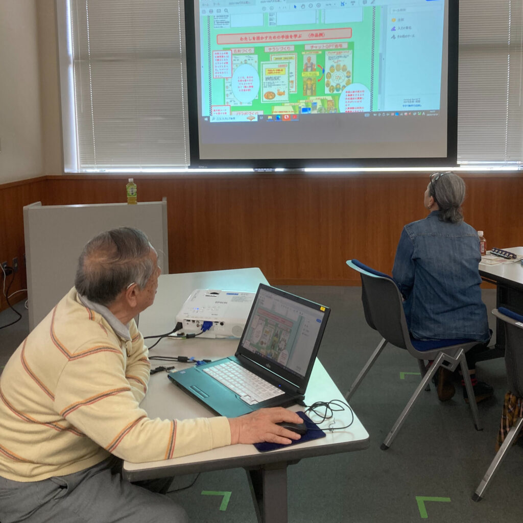 まず最初に、ウィズフェス出展に向けて、受講生それぞれのアイデアを持ち寄り意見交換をしました。松尾講師が意見の整理をし、作業部会方式でパネルを作る班、資料を作る班、体験コーナーを計画する班と役割を決めてからスムーズに話が進みました。