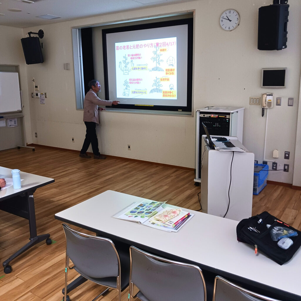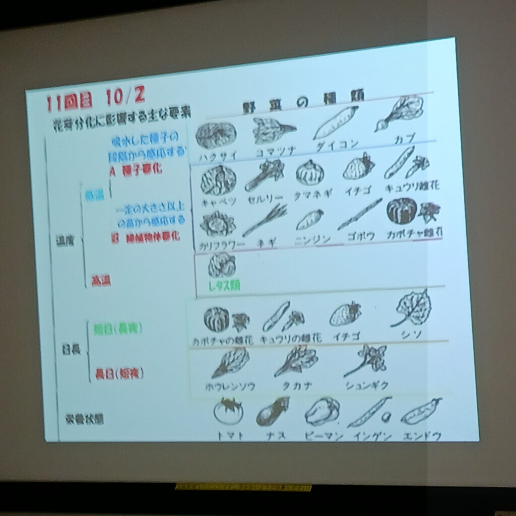 1月26日の野菜づくり学科は、今年度の最終講座となりました。最後は野菜全般について、主に「夏野菜」と「秋野菜」についてのお話です。実習ではなく教室での座学ですが、質疑応答ではいつも通り、皆さんの野菜についての疑問に、池上先生はわかりやすく丁寧に答えてくれました。