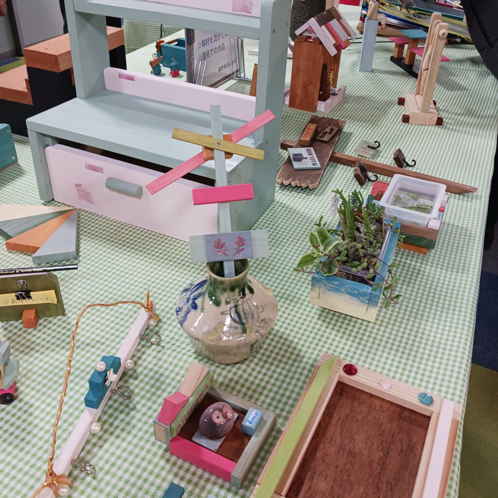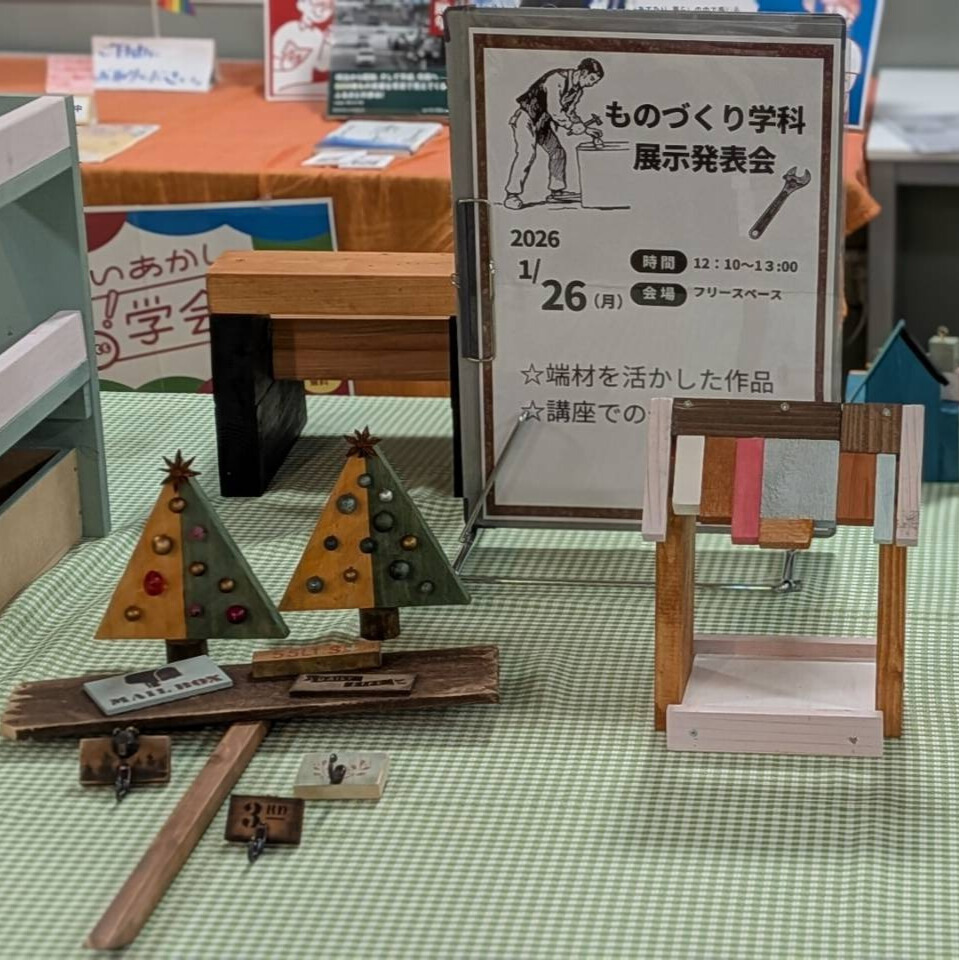 1月26日のものづくり学科では、端材を活用した自由製作による作品の展示発表会をしました。