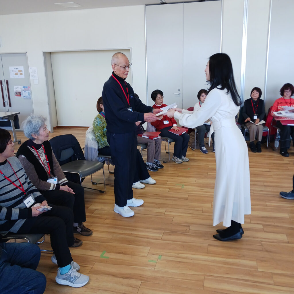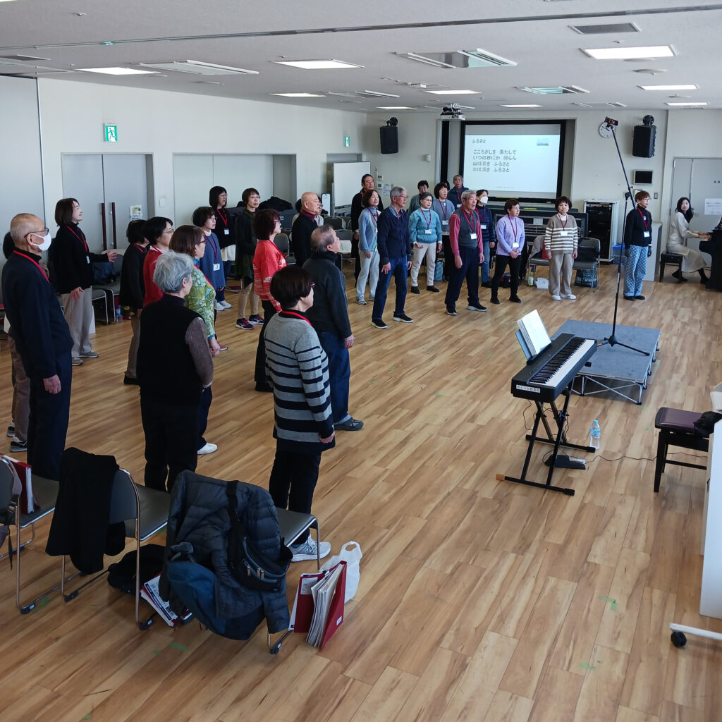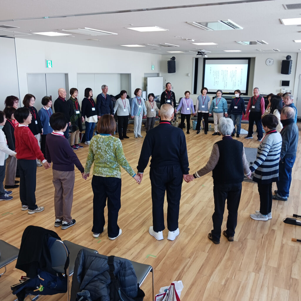 最後は全員で輪を作り手をつないでの合唱です。江本講師が録音され、入学当初の歌声音と比較し評価していただきました。