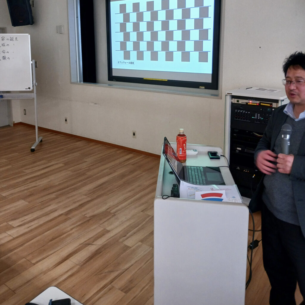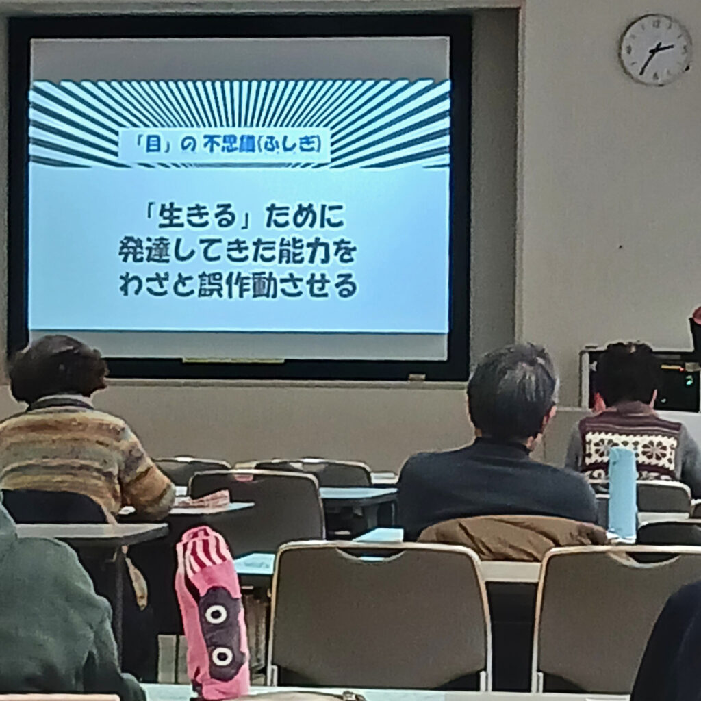 今までの振り返りと、今後の展望としての実践例として「気軽にできるおもしろ実験」の解説と実習を行いました。目の錯覚を利用した実験を、最後にみんなで楽しみました。