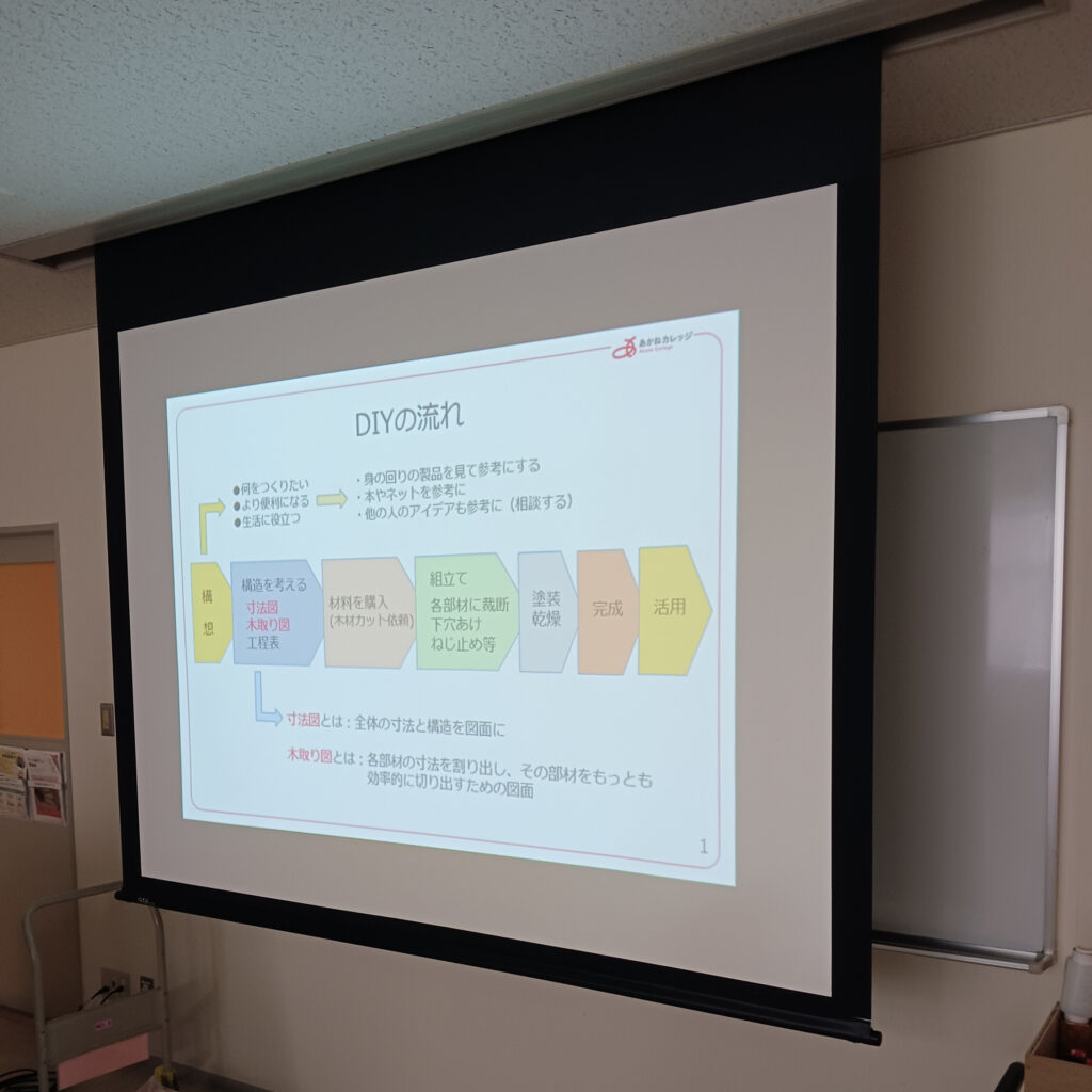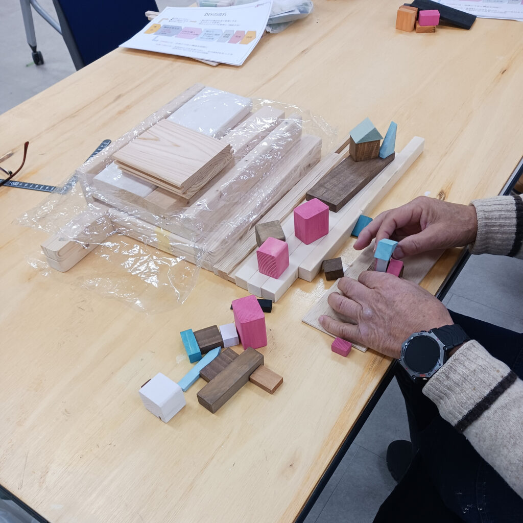 2月9日のものづくり学科では、前回講座に引き続き、端材を活用した自由製作に取り組みました。4月から5つの作品を製作し、木工DIYの基礎を学んできた成果が自由製作作品に現れています。