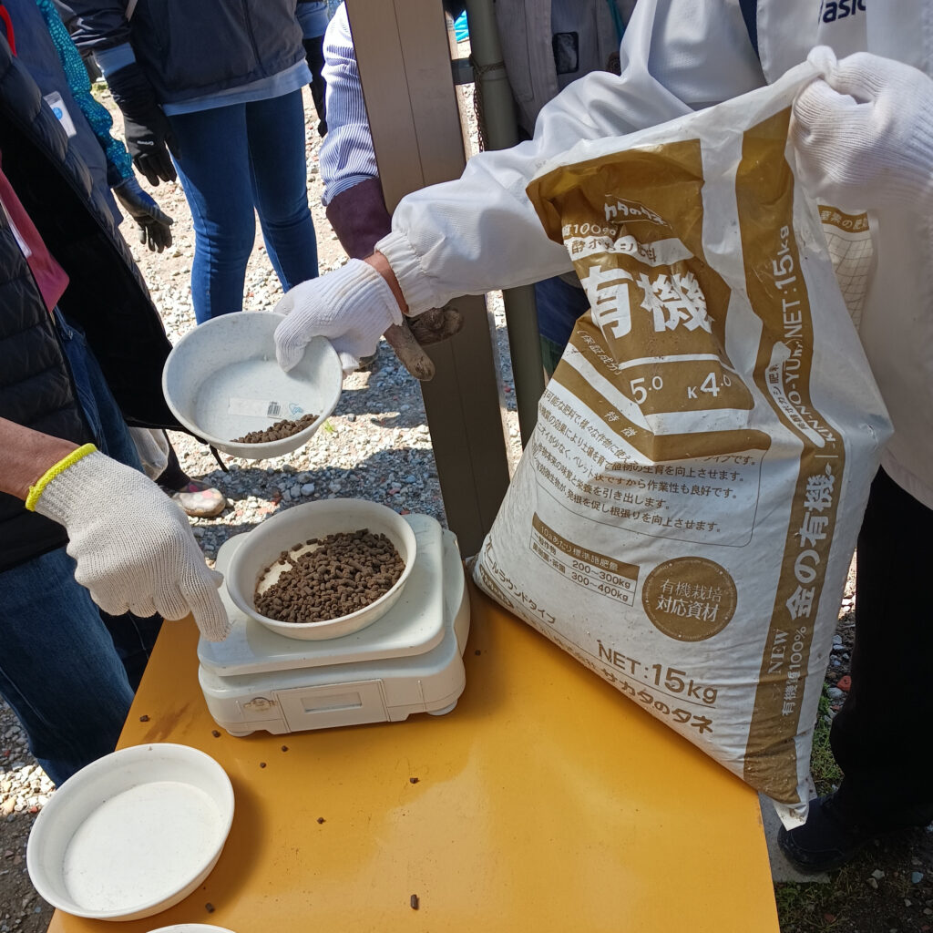 いよいよ畑での実習です。第1回の講座は「畝つくり」でした。池上講師による説明の後、一人ひとりに割り当てられた畝を耕し、肥料をまきました。