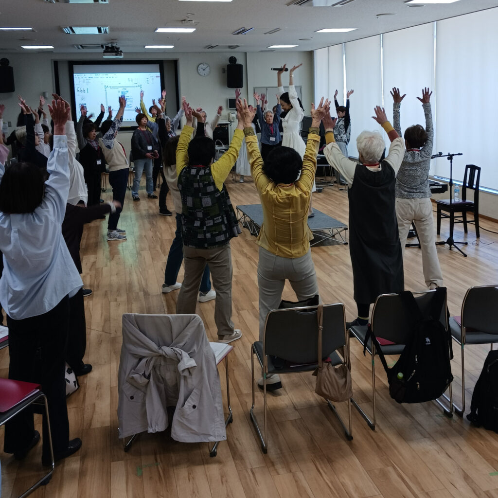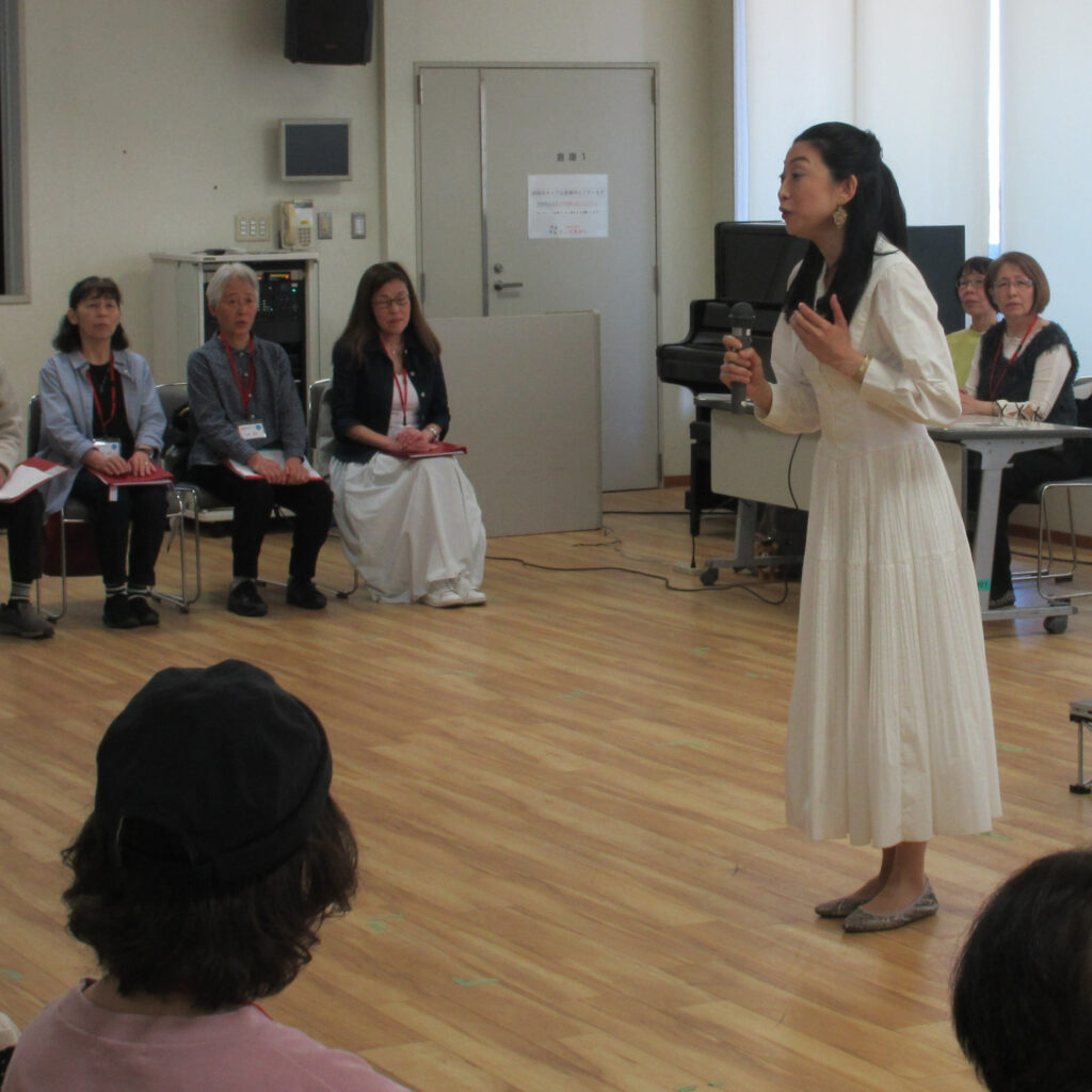 皆さん、緊張した面持ちでのスタートでしたが、江本あきこ講師の体を使った発声法や、ユーモアのある解説などに触れることで、少しづつ心と体がほぐれてきたようです。