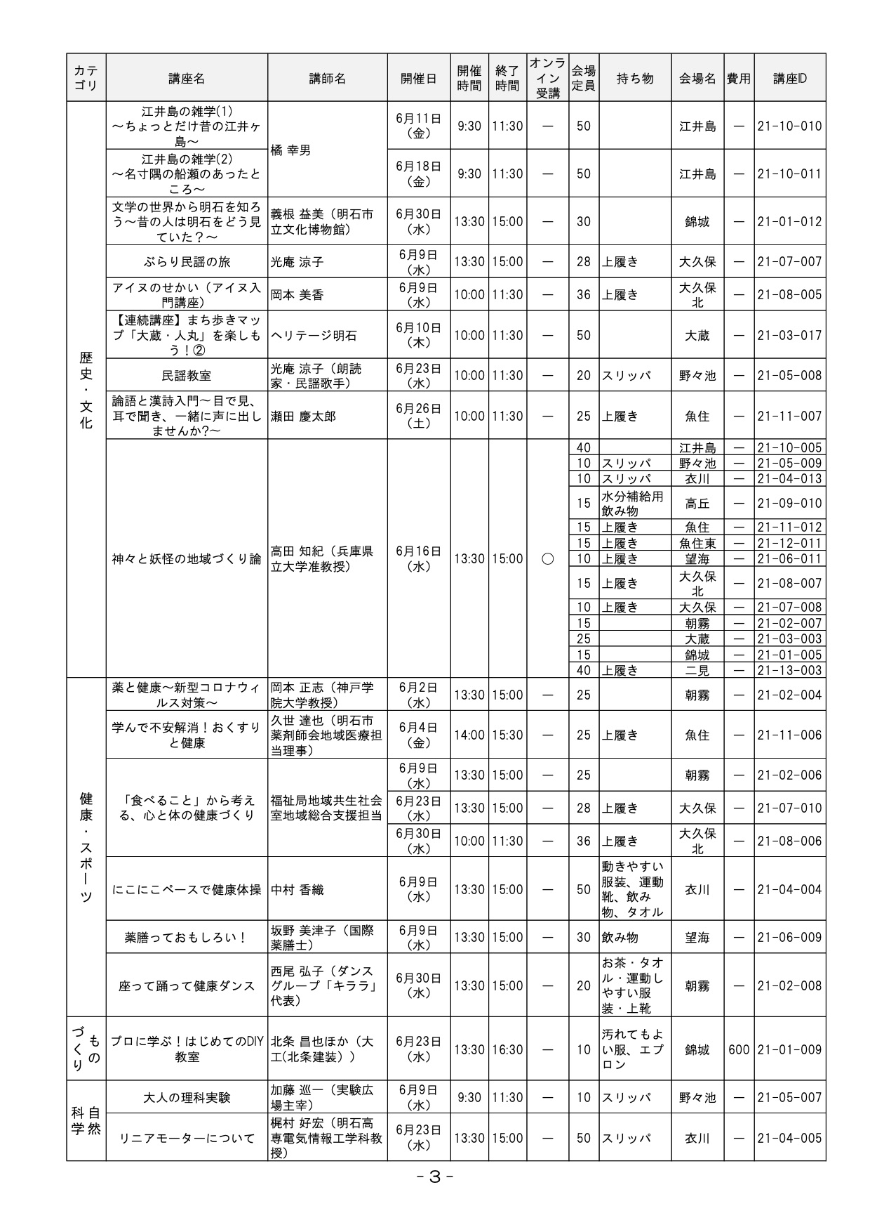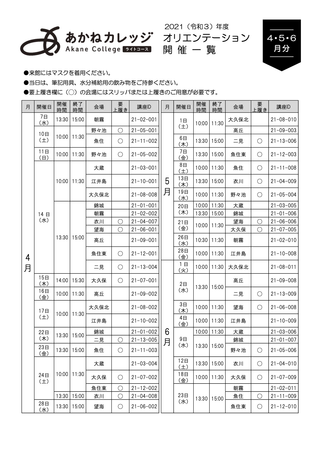 2021(令和3)年度4・5・6月の講座一覧を公開しました 2021年03月15日 お知らせ2021年度4・5・6月の講座一覧を公開しました。選択講座の申込み開始は4月27日 9:00開始です。2021年度4・5・6月分のオリエンテーション一覧2021年度5・6月分の選択講座一覧